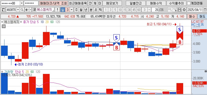 에스엠씨지였던가 2차vi와 상한가가 거의 한호가 라서 처음으로 짝꿍 매매라는걸 해보았다 상