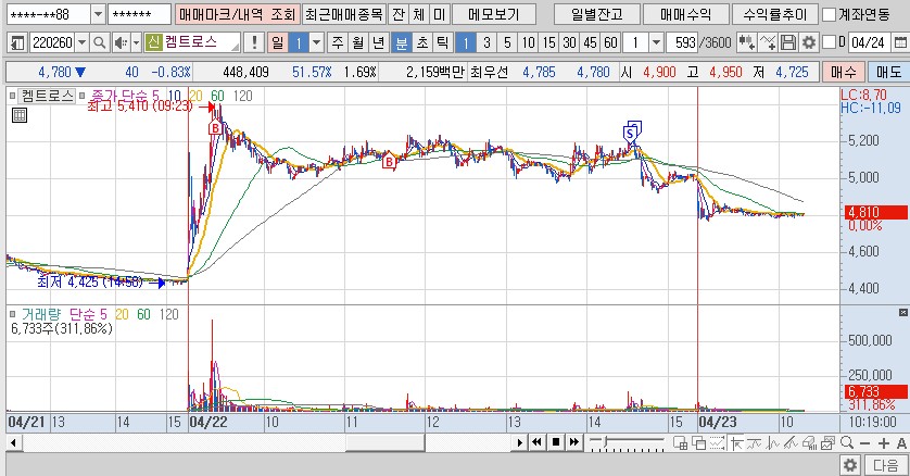전체수익 26454 정말 아쉬운 날이다 켐트로스 타점이 이해가 안간다 내가 왜 그랬는지.. 정신 차리고 매수하자